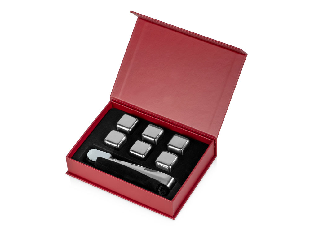 —Набор для виски со стальными охлаждающими камнями, щипцами, мешочком в коробке, кашированной картоном.