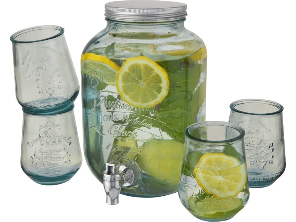 Набор для напитков из 5 предметов, изготовленный из 100% переработанного стекла. Включает 4 стакана (400 мл) и 1 дозатор (4 л) с крышкой из нержавеющей стали. С этим набором для напитков с дозатором вы можете подавать сангрию, свежевыжатый сок и холодный чай в большом масштабе со всеми функциями, которые вам понадобятся, чтобы вечеринка прошла великолепно. Наливать напитки очень удобно благодаря установленному крану из нержавеющей стали в сборе. Все предметы изготовлены из переработанных стеклянных бутылок. На изготовление переработанного стекла затрачивается меньше энергии, сырья и добавок, чем на изготовление традиционного стекла. Можно мыть в посудомоечной машине.