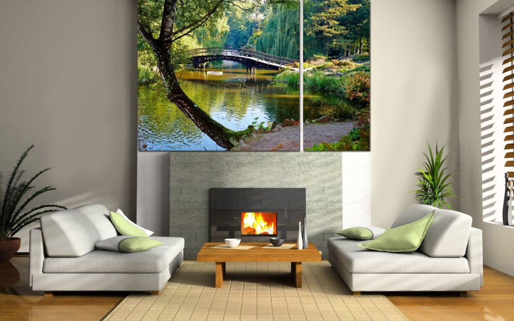 Модульные картины позволяют не только акцентировать внимание зрителя на определенных деталях, но и удачно скрывают неуместные конструкционные элементы дома.