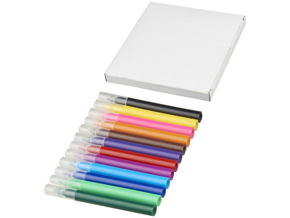 12 цветных маркеров в бумажной подарочной упаковке. На маркерах невозможен принт. Тампопечать (1 цвет (белые изделия)) на данный товар осуществляется бесплатно. Оплачивается только настройка оборудования в размере 4500 рублей на весь тираж.