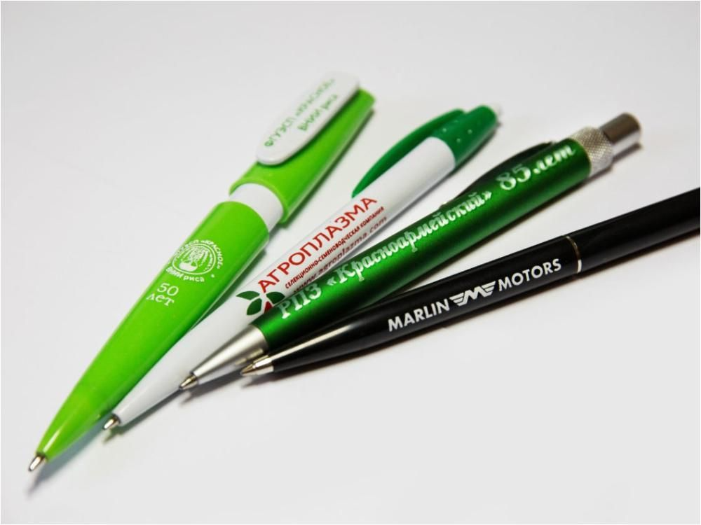 Должны соответствовать особенностям переносимого изображения. Красный логотип будет хорошо смотреться на белом фоне. Для более крупных надписей понадобятся ручки большего диаметра. Изделия с широкими клипами можно использовать для раздельного нанесения, например логотипа на поверхность ручки и надписи-слогана на клип.